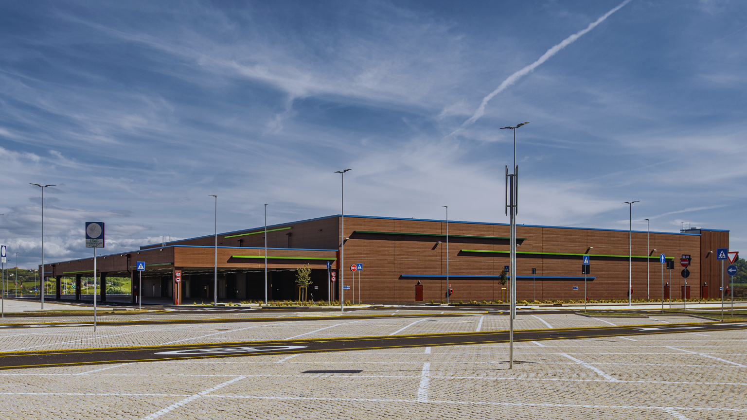 La piattaforma logistica si sviluppa su 7.600 mq, con un magazzino di 5.700 mq e una tettoia esterna di 1.900 mq. Gli uffici occupano 1.200 mq, mentre l’area esterna comprende 123 parcheggi auto, 409 parcheggi van e 7 baie di carico. Un impianto fotovoltaico da 120 kWp contribuisce all’efficienza energetica complessiva.